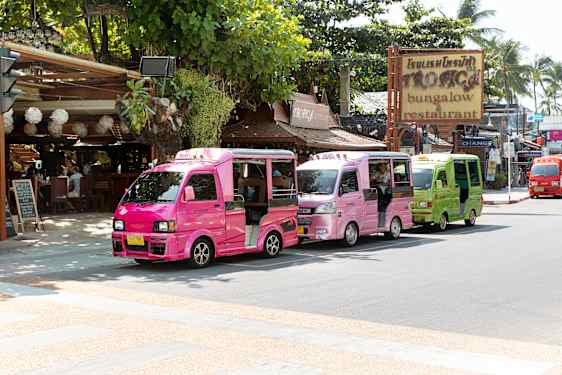 Tuk-tuks are plentiful in Patong and Phuket Town, although when travelling to many areas in the north or south part of the island you may need to some negotiations with the driver for the best fare due to shortage of tuk-tuks that shuttle offer return journeys. Depending on the distance, it usually start at around ฿100-200 per hour.